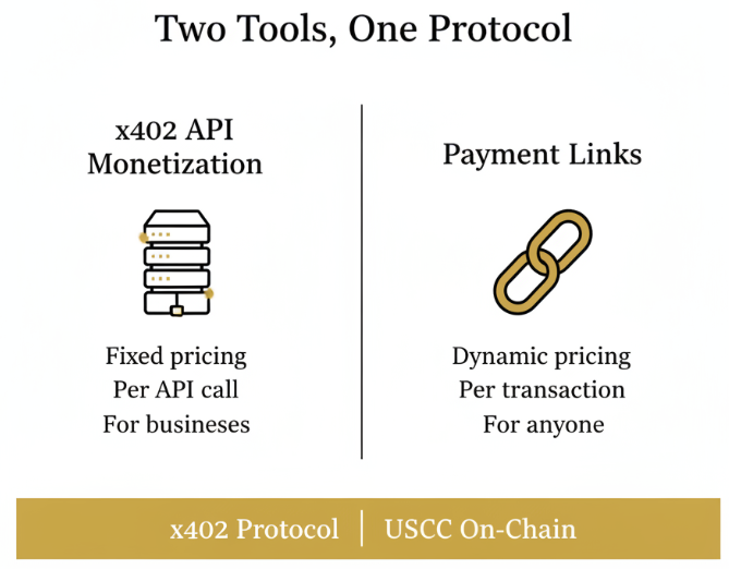 x402 API monetization is for businesses running services with fixed per-endpoint pricing and a server. Payment Links are for everyone else — pricing is dynamic and per-transaction, no server is needed, and any agent with a wallet can sell. Both use x402 underneath and settle in USDC on-chain.